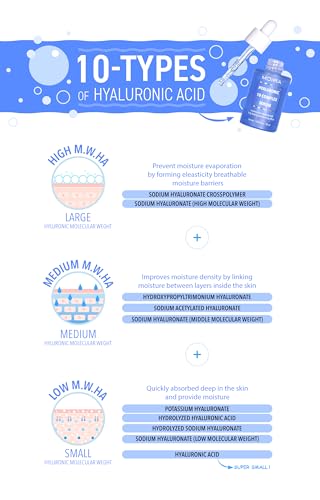 . . MOIRA Hyaluronic 10 Complex Serum is an ultra-hydrating face serum with 10 Hyaluronic complexes that hydrate and visibly plump while replenishing the skin barrier and improving the look of fine lines. This formulation combines low, medium, and high molecular weight hyaluronic acid, to help achieve plumper, smooth-looking, and moisturized skin. Suitable for day and night.. . . – Cruelty-Free. – Paraben-Free. – Sulfate-Free. – Phthalate Free. – Gluten-Free. – Made in Korea. . HOW TO USE:. Apply 1-3 drops after cleansing onto palms, and press on face alone or under your favorite moisturizer. Use daily day and night.. PERFECT FOR WHAT SKIN TYPE:. . – . All skin types. . . NET WEIGHT:1.014 fl. oz / 30 ml . . . Ingredient List . INGREDIENTS. Water (Aqua), Methylpropanediol, Glycerin, Dipropylene Glycol, Glycereth-26, Diethoxyethyl Succinate, Sodium Hyaluronate, Potassium Hyaluronate, Hydrolyzed Hyaluronic Acid, Hydroxypropyltrimonium Hyaluronate, Hydrolyzed Sodium Hyaluronate, Hyaluronic Acid, Hyaluronate Crosspolymer, Sodium Acetylated Hyaluronate, Ceramide NP, Betaine, Trehalose, Carbomer, Tromethamine, Xanthan Gum, Ethylhexylglycerin, Ethylhexyl Methoxycinnamate, 1,2-Hexanediol, Disodium EDTA, Tocopheryl Acetate, Polyglyceryl-10 Myristate, Niacinamide, Melia Azadirachta Leaf Extract, Melia Azadirachta Flower Extract, Coccinia Indica Fruit Extract, Streptococcus Thermophilus Ferment, Lactobacillus Ferment Lysate, Bifida Ferment Lysate, Cetyl Ethylhexanoate, Caprylic/Capric Triglyceride, Ethylhexyl Palmitate, Solanum Melongena (Eggplant) Fruit Extract, Butylene Glycol, Ocimum Sanctum Leaf Extract, Hydrogenated Lecithin, Curcuma Longa (Turmeric) Root Extract, Corallina Officinalis Extract, Butyrospermum Parkii (Shea) Butter, Pentylene Glycol, Sodium Phenoxyethanol, PEG-60 Hydrogenated Castor Oil, Fragrance, Limonene, Linalool..