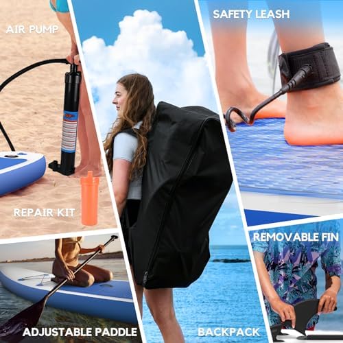 The blow up paddle board, meticulously crafted to cater to paddlers of all skill levels, from novices to seasoned adventurers. Engineered with an unwavering focus on stability and safety, this board is your steadfast companion on every aquatic journey. Equipped with premium anti-slip EVA decks, it guarantees unparalleled balance and traction, empowering you to navigate with confidence across any water terrain. Its robust construction ensures a secure ride, allowing you to push the boundaries of your paddling prowess without hesitation. Each board comes complete with a comprehensive array of essential accessories, including a paddle, pump, leash, backpack, and repair kit, ensuring convenience and peace of mind from the moment you embark on your aquatic escapade. With dimensions spanning 10.6 feet in length, 32 inches in width, and 6 inches in thickness, and boasting a generous weight capacity of up to 330 lbs, this board epitomizes versatility and stability. Whether you’re exploring serene lakes, meandering rivers, or embracing the gentle swells of the ocean.