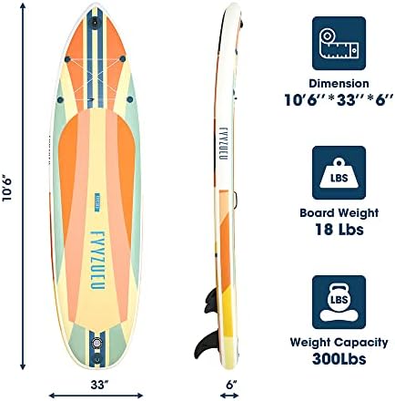 ANTI-SLIP & WIDER SURFACE – The soft anti-slip EVA deck of our 10’6×33″×6″ inflatable SUP is broader than standard ones, making it more pleasant to stand on and ideal for riders with small children or dogs. Professional grade PVC and innovative bonding technology make it a long-lasting paddleboard with added stability. The FYYZUEU inflatable stand up paddle board is ideal for all levels of paddlers, from the novice to the expert.
