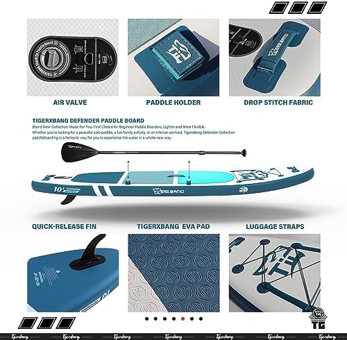 【Lighter and More Flexible】The TIGERXBANG Defender Collection inflatable paddle board is made of ultra-light military-grade PVC material, which has excellent wear resistance, toughness, and a long service life. With a size of 10′ x 31″ x 6″, the paddle board is lighter, more portable, and easier to operate, allowing paddlers to navigate various complex water flow environments with more flexibility.