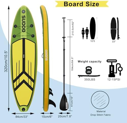 Wide and Lightweight Stand-Up Paddleboards: SUDOO Inflatable Stand Up Paddle Board measures 10.5′ long 33″ wide and 6″ thick for improved stability and balance while standing. Paddle Board is made of the highest quality military grade material. Providing the most durable lightweight SUP Paddle Boards on the market. Perfect for Leisure Stand-up Paddle Board, Touring Paddle Boarding, for you riding the waves or practice a Stand Up Paddle Board. Maximum load-bearing capacity is up to 350 lbs.