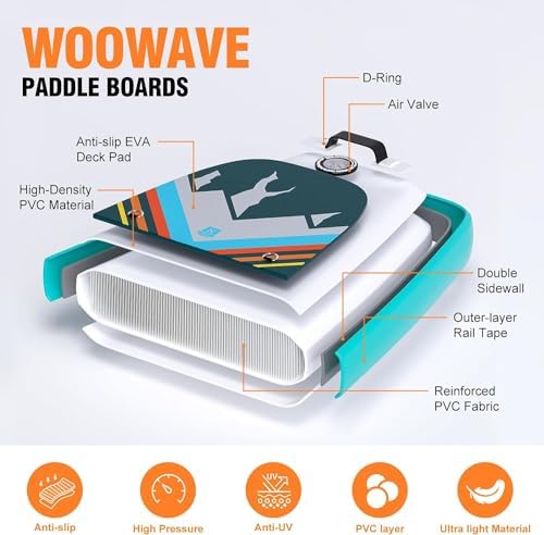 🏄𝗠𝘂𝗹𝘁𝗶𝗽𝘂𝗿𝗽𝗼𝘀𝗲 𝗨𝘀𝗲: WOOWAVE standup paddle board size is 10’2″X32″X6″, suitable for all skill levels, ideal for adult beginners and professional athletes. Can be used in different waters, including oceans, lakes, rivers, etc., very suitable for water surfing, water yoga, sunbathing, fishing, etc