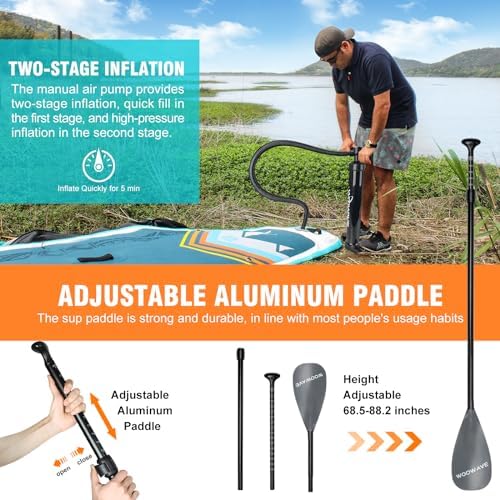 🏄𝗖𝗼𝗺𝗽𝗹𝗲𝘁𝗲 𝗔𝗰𝗰𝗲𝘀𝘀𝗼𝗿𝗶𝗲𝘀: The sup paddle board set is your new adventure companion, the paddle board comes with three-section adjustable paddles, a dual-action hand pump, coil ankle straps, a travel backpack, and a user manual. We provide 1-year free replacement, if you have any problems after receiving the product, please feel free to contact us, WOOWAVE after-sales service center will provide you with a satisfactory solution