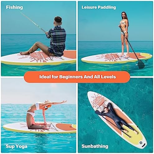 🌊【Wide Stable Design for Better Balance】 The dimensons of paddle board is 10.4ft length, 33 inches width and 6 inches thickness, achieved amazing balance ability. The 2 bottom fins design and a removable center fin help improve overall speed and maneuverability. Easy handling and steering by kids, teens and adults. In addition, the upgraded non-slip soft deck is an ideal for all skill levels for less accidents or injuries while you fall!