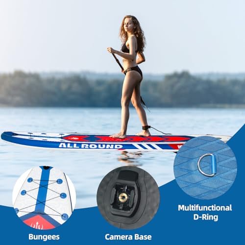 【Camera Mount Design】Crafted from premium materials, this inflatable paddle board measures 10’6″ x 33″ x 6″ and weighs 20 lbs with a weight capacity of up to 380 lbs. Durable, stable, and suitable for adults of all skill levels. Features a sport camera bracket mount on the paddle board for easy installation of your camera to capture moments on the water.
