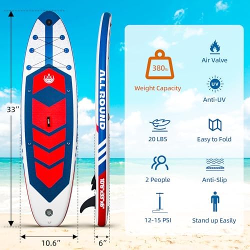 Crafted from premium materials, this inflatable paddle board measures 10’6″ x 33″ x 6″ and weighs 20 lbs with a weight capacity of up to 380 lbs. Durable, stable, and suitable for adults of all skill levels. Features a sport camera bracket mount on the paddle board for easy installation of your camera to capture moments on the water.