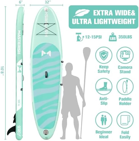 ATTENTION TO QUALITY AND DETAILS】- QUALITY FIRST.The Masterish inflatable paddle board is made of high quality material PVC, measures 10’8 x 32″ x 6″, weighs 14 lbs, and has a maximum load capacity of 350 lbs. It is a durable, stable paddle board for adults of all skill levels and great for carrying furry pets.