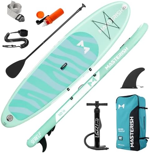 ENHANCED TRACTION AND COMFORT FOR GREAT FEET】- The Masterish Inflatable Stand Up Paddle Board features non-slip EVA decking for excellent durability, slip resistance and comfort. This inflatable paddle board can be used in a variety of water conditions such as oceans, lakes and rivers, and is versatile enough to be used for yoga, surfing, exploring, traveling and fishing.