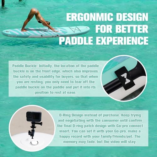 INFLATABLE PADDLE BOARD DESIGN: Enjoy relaxation and comfort in the water with the specially designed inflatable paddle board. Equipped with a D-ring for easy logging of your water adventures and side paddle holders that allow your hands to relax on the board. Enhance your water adventure experience with innovative design and features. Experience the convenience and freedom this paddle board offers you for unforgettable times on the water.