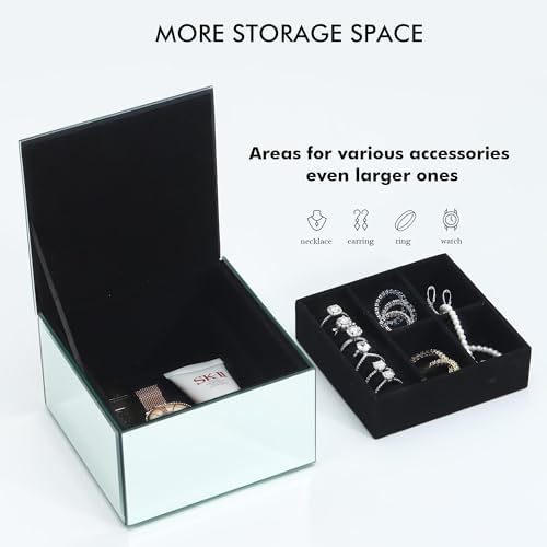 [2-Layer Multi-Functional Space] This glass jewelry box has 7 ring slots as well as 4 larger accessory compartments for necklaces, and a lower compartment for watches, necklaces, bracelets or cosmetics, of course it’s all up to you.