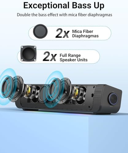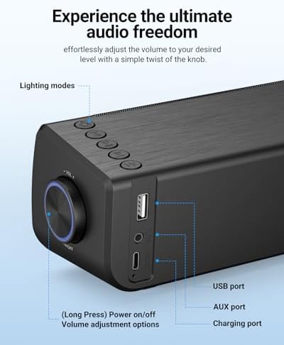 𝗣𝗼𝗿𝘁𝗮𝗯𝗹𝗲 𝗦𝗽𝗲𝗮𝗸𝗲𝗿𝘀 𝘄𝗶𝘁𝗵 𝗕𝘂𝗶𝗹𝘁 𝗶𝗻 𝗙𝗠: Thanks to the built-in 2000mAh battery, we’ve made this computer soundbar portable, allowing you to effortlessly take it from your desktop to the living room, or even the backyard. What’s more, this computer speaker features a built-in FM radio, offering you even more entertainment from your favorite FM radio channel.