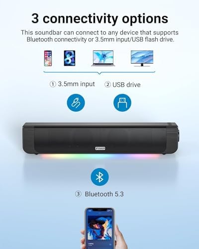 𝟯 𝗪𝗮𝘆𝘀 𝘁𝗼 𝗖𝗼𝗻𝗻𝗲𝗰𝘁: Support Bluetooth 5.3 connection, 3.5mm Aux-in wired connection, and USB connection(USB flash disk only). The computer soundbar is widely compatible to various devices, such as computer, laptop, tablet, monitors, smartphones and TV.
