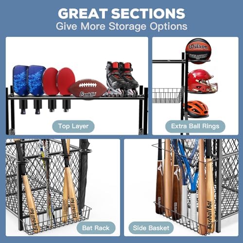 【New Arrival Larger Capacity】Our sports equipment storage features 3 layers in total which include 2 main storage bins,1 side basket, 1 moveable middle basket, special designed top layer, EXTRA ball ring rack, bat rack with bottom basket and 6 hooks. Easy to store all kinds of rolling balls like baseball, footballs, soccer balls, volleyball; large equipment such as helmets, athletic shoes; slim sports gears like baseball bat, hockey racks.