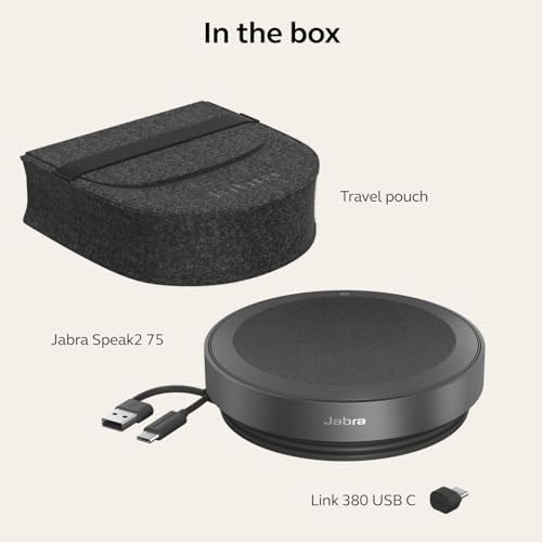 IN THE BOX – 1x Jabra Speak2 75 Bluetooth Wireless Speakerphone with USB-C Cable with USB-A Adapter and Link 380 USB-C Bluetooth Adapter, Carry Pouch, Safety Leaflet, Mini Portable Speaker Weight: 466g / 16.44oz, Color: Dark Grey
