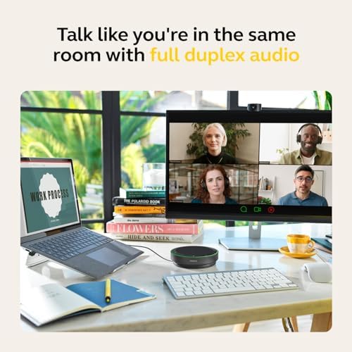EQUALIZES VOICES – Four beamforming microphones in this Jabra speaker reduce background noise, while the microphone quality indicator shows how well your voice is captured. Voice Level Normalization technology equalizes all voices to the same level.