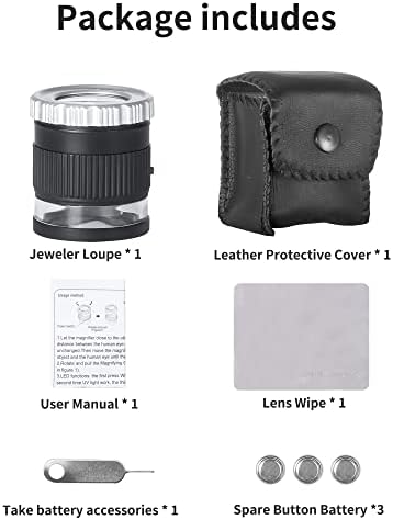 PORTABLE DESIGN: JARLINK loop jeweler is easily Storage in your pocket or cloth bag when not needed. The package contains 1*take battery accessories, 3*LR927 button batteries, 1*loupe, 1*product manual, 1*lens wipe, 1*bag. If not, please contact us in time.