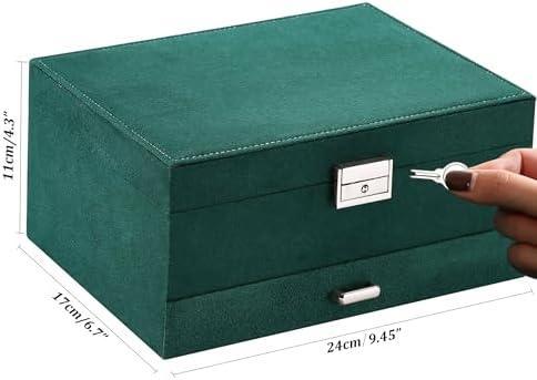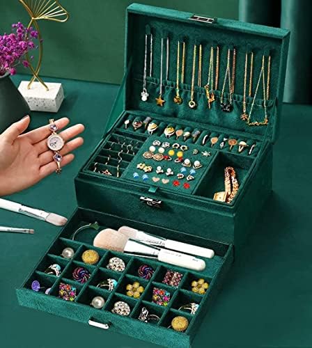 3 layers dorm jewelry boxes & organizers with drawer36+30 pierced earring holder holesAdvanced soft velvet jewelry box largeExquisite women mens jewelry box with Lock KeyBig Capacity jewelry box for women girls emerald with 8 necklace hanger hooks +1 elastic jewelry pocket+ 66 stud earrings holder+17 rings holder case+ 27 hoop earrings organizer case +1 watches organizer +1 Thick necklace storage case+ 6 removable bracelets organizer case.