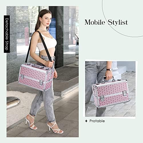 Joligrace Makeup Train Case Professional Cosmetic Organizer Aluminum Storage Box with 4 Adjustable Dividers Trays Lockable Portablewith Shoulder Strap – Neutral Pink