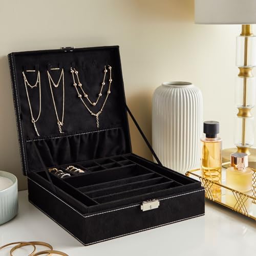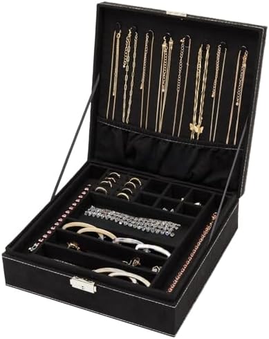 Black Jewelry Box for the Discerning: Use this 2-tier jewelry box with a lock for organizing jewelry including rings, earrings, necklaces, and bracelets; durable enough for travel, elegant and sophisticated enough to be set on a dresser or bathroom counter at home