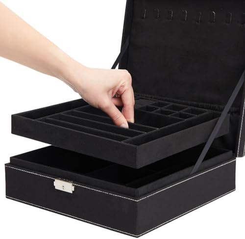 Juvale Velvet Jewelry Box Organizer – Lockable 2 Layer Travel Case, Earrings Storage with Removable Tray for Women, Men (Black)