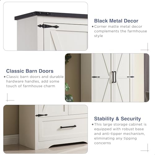JXQTLINGMU Farmhouse Storage Cabinet with Adjustable Shelves, 72″ Tall Kitchen Pantry Storage Cabinet with Drawer & 2 Barn Doors, Versatile Storage for Kitchen, Dining Room, Bathroom, Antique White