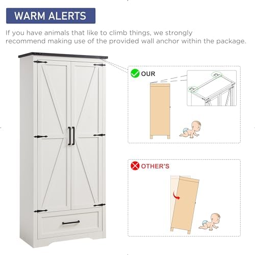 【Multi-Purpose】 This tall storage cabinet with doors and shelves and drawers boasts an immense storage capacity, making it perfect for a wide range of uses. Whether you need kitchen pantry storage for cutlery, plates, spices, or crockery, even manage bathroom towels and toiletries, utility room odds and ends, and more, this wood storage cabinet is an ideal choice.
