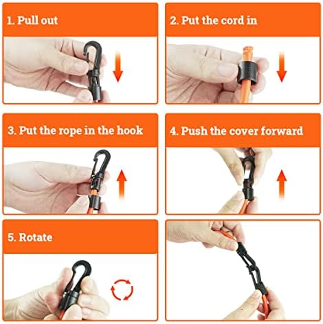 A 9.8 feet 1/4 inch elastic bungee cord6PCs D rings with stainless steel screws4Pcs J hooks with stainless steel screws4PCs Bungee Cord Ends hooks