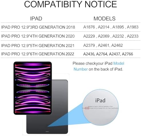 Compatibility – Compatible with 2022 iPad Pro 12.9 case with keyboard 2022 6th Generation(A2436 A2764 A2437 A2766); 2021 iPad Pro 12.9 inch 5th generation(A2378 A2461 A2379 A2462); 2020 iPad Pro 12.9-inch 4th Gen(A2233 A2229 A2069 A2232), 2018 iPad Pro 12.9 inch 3rd Gen 12.9(A1876 A2014 A1895 A1983). Not fit iPad Pro 12.9 2015 / 2017. Please carefully check the model number on the back of your iPad.