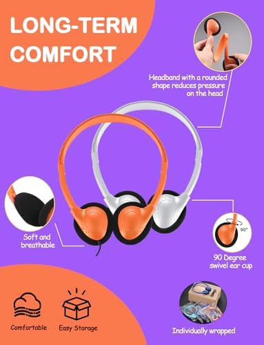 Comfortable: Student headphones are lightweight, with padded ear cushions, Wired Headphones for Kids an adjustable headband that fits all sizes, allowing kids to wear them for hours and still be comfortable. Classroom headphones cables are made of sturdy PVC material, 1.2 m/ 47.25 inches long, Enough free space for children.