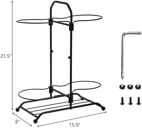 Ball Rack Dimensions: The overall size of the ball storage rack is 16 L x 8W x 21.5H inches, and it comes in black. The double-layer double-sided basketball storage rack can hold 4 balls, such as basketballs, football, volleyball, etc., neatly in place. Keeps the ball all in one place instead of all over the yard and driveway.