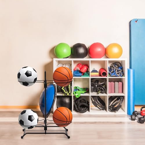 Lawei Metal Basketball Ball Storage Rack, 4-Ball Double Side Sports Equipment Stand Holder, Ball Organizers Rack Display Stand for Home Garage Rugby Basketball Football Volleyball Storage, Black