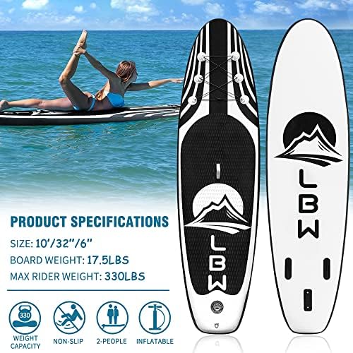 【HIGH QUALITY INFLATABLE PADDLE BOARDS】LBW Inflatable Stand Up Paddle Board is 10′ x 32” wide x 6” thick, weighs 17.5 lbs, and has an air pressure limit of 15 Pa. The 330-pound weight capacity helps you stand and balance well. The extra-wide SUP design is the ideal all-around paddle board for adults, teens, youth and all skill levels.