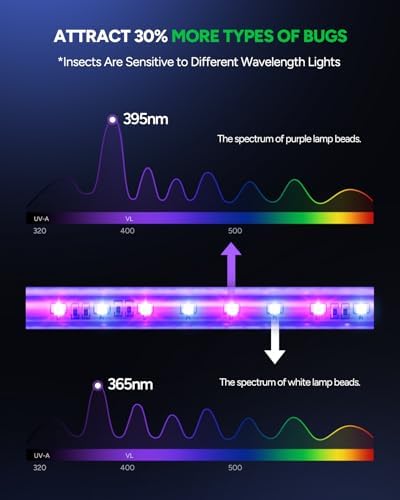 High-Efficiency Energy-Saving LED Tubes: Our bug zappers use 5W low-energy consumption LED tubes, boasting a long lifespan of up to 10 years. Utilizes a blend of 365nm and 395nm wavelength LED beads, producing a dual-tone light spectrum. This combination is more effective in attracting a wide variety of insects, including mosquitoes, gnats, flies, and moths, to quickly hit them with high-voltage electricity.