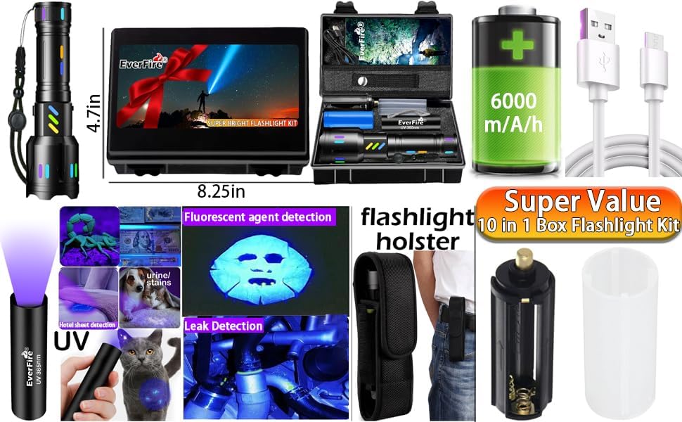 【VALUE 10 IN 1 CASE FLASHLIGHT KIT & 2-YEAR WARRANTY】 This flash light comes with 1X EX007 flashlight, 1X 6000mÁh rechargeable battery, 1X Rechargeable 365nm black light UV flashlight, 1X Portable storage gift box, 1X USB C charging cable,1X micro USB charging cable, 1X Holster, 1X Wrist lanyard , 1X AAA battery rack holder, 1X Battery tube, 1X Users manual and 2-YEAR WARRANTY. We alos offer 24/7 customer support.If you have any questions, please feel free to contact us.