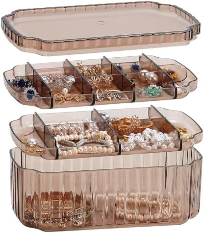 LETURE 3-Layer Jewelry Organizer Box for Earrings, Rings, Necklaces, Bracelets, Clear Plastic Bead Storage Containers for Crafts (Coffee)