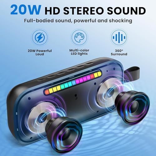 【Brilliant stereo sound and Enhanced bass】Portable bluetooth speakers soundbox delivers 20W amazing loud and well-balanced sound with enhanced bass based on two high quality full range drivers and the proprietary technology.The advanced Digital Signal Processor ensures pounding bass and zero distortion at any volumeny volume.Portable bluetooth speakers supports TWS connection, you can enjoy brilliant stereo surround sound via two speakers bluetooth wireless .