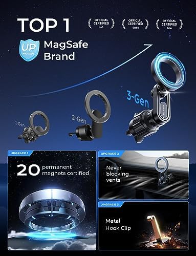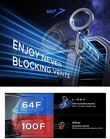 👍More Stable, Less Blocking: LISEN brand laboratory has upgraded this magsafe car vent mount from 3 directions.①Upgrade extension arm to protect your phone overheating crash; ②Cell phone holder for car mount with most stable “Steel Hook”;③Magnetic phone car mount that has the strongest magnet force, which can hold up to 10 iPhone 14 Pro Max. LISEN provides at least 1 years of user service
