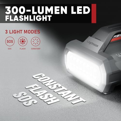 🚗【4-IN-1 Multi-Function】Not only a car battery booster, a Tire Pumper, but also a portable power bank, a LED flashlight. Support fast charging/USB 3.0, adapt smart phones, tablets and other USB devices. Input:5V/3A and 9V/2A, Output:5V/3A and 9V/2A. The integrated 300-lumen LED flashlight has 3 lighting modes, constant lighting, flash and SOS.