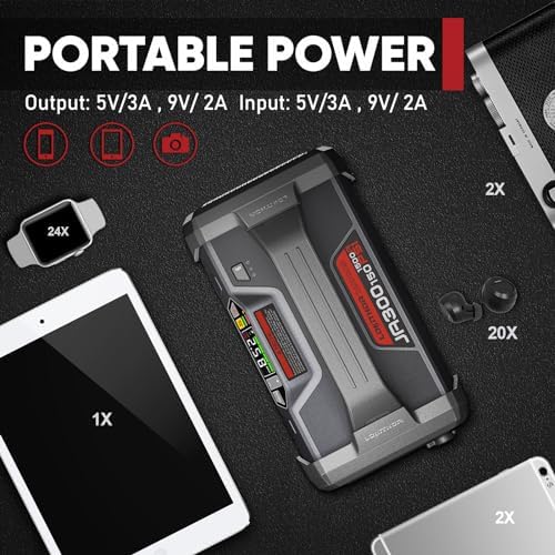 🚗【Multi-Protection & UL Listed】Jump starter can detect itself voltage in real time and alarm for abnormal conditions. Built-in Latest BMS power management system, provides short-circuit protection, over-curent protection, reverse connection protection, over-heat protection, over-charging protection and clip falling off protection. UL-2743 listed, make the ultimate protection for you and your car safety.