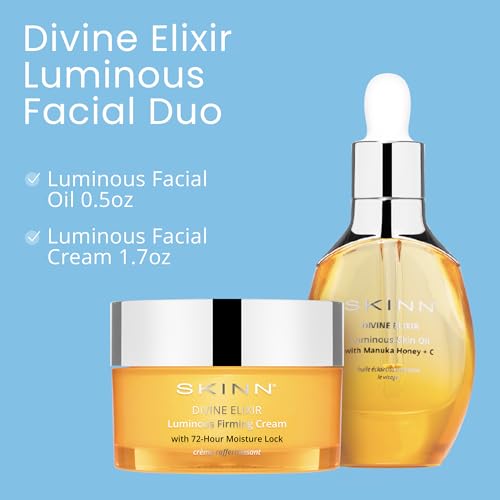 Divine Elixir Duo Bundle: Experience the SKINN Luminous Facial Oil and Firming Cream Duo – a perfect skincare set that helps reduce fine lines, wrinkles, and strengthens your skin’s barrier. This Duo includes a 0.5 oz bottle of Luminous Facial Oil and a 1.7 oz container of Luminous Firming Cream, working together to deeply hydrate, firm, and brighten your skin for a more even tone and texture.