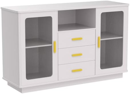 🟦 【Large Storage & Durable Material】This 47.2″ wood accent cabinet is constructed with MDF with excellent stability and high gloss finishes that are easy to clean up. Has 3 drawers and 2 side compartments to store different items such as necessities, plates & cups, and the top can also be used to display your books, vases, and photo frames for decorating your living room / kitchen / bedroom / entrance / hallway / entryway.