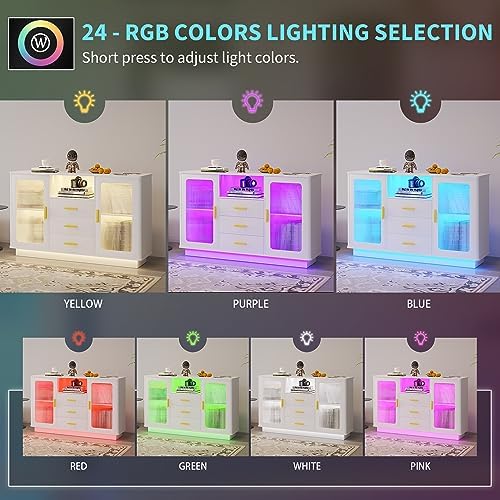 🟦 【Dimmable 24 Colors LED Lights】This storage cabinet is built with 24 colors of LED lights. Change the lighting to create the desired atmosphere. Short press the light button to change colors. Long press the light button to change the brightness from 10% to 100%.