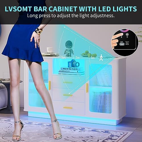 LVSOMT Sideboard Buffet Storage Cabinet with LED Lights, Modern Kitchen Bar Cabinet, High Gloss Wood Accent Cabinet, Console Table for Living Room (Matte White)