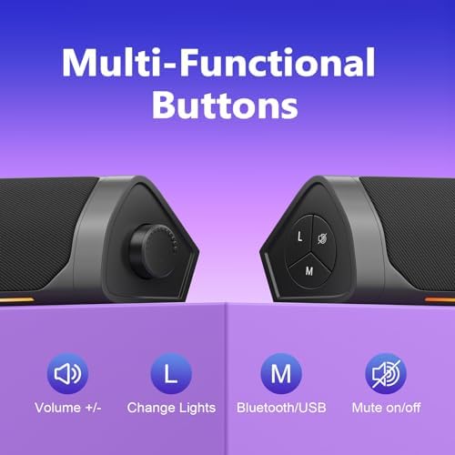 【7 Colorful Light Models】For people who like computer games, we specially installed an LED light bar with 7 light modes on the bottom of the speaker. Unlike other LED lighting speakers, our light bar is mounted on the bottom of the speaker. To avoid the glare of usual lighting, our light bar emits 8.7″ long by 0.4″ wide gentle LED light onto the tabletop. This avoids eye fatigue while ensuring the gaming lighting effects.Attention:Our LED lights cannot beat with the rhythm of music like RGB lights