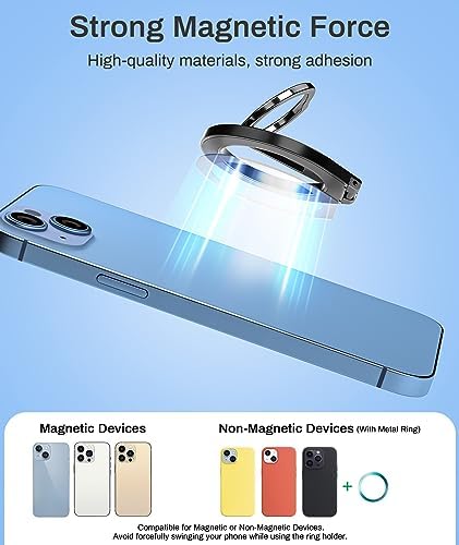 【Universal Compatibility】This magnetic phone grip is compatible with any phone or ferromagnetic object. It seamlessly attaches to MagSafe devices, and for enhanced magnetism, an additional magnetic ring is included. For non-MagSafe devices, simply attach the magnetic ring to the back for direct compatibility.