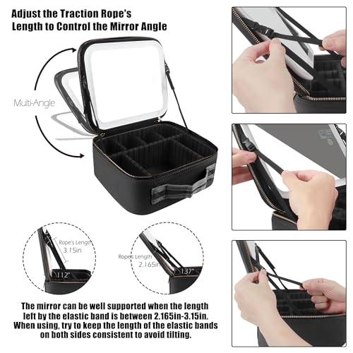 Makeup Bag with Mirror and Light Travel Makeup Train Case Cosmetic Organizer Portable Artist Storage Bag with Adjustable Dividers Makeup Brushes Storage Organizer Black
