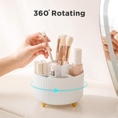 Makeup Brush Holder, 360° Rotating Makeup Brush Organizer, 5 Slot Large Capacity Cosmetic Brushes Storage Countertop for Vanity, White