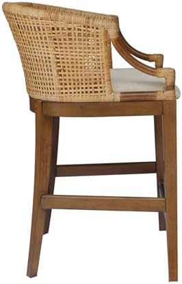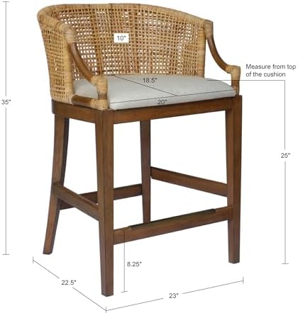 Elevate your dining décor with the Playa Counter Stool, inspired by Martha Stewart’s home on Lily Pond Lane in East Hampton. This stylish counter stool effortlessly adds a touch of country or farmhouse style to any kitchen aesthetic. The counter stool showcases a natural rattan rounded back with recessed arms, creating a fashionable look that enhances the overall ambiance of your space. For optimal comfort, the fixed cushioned seat is upholstered in a soft linen fabric, adding a casual and cozy feel. The solid wood legs are equipped with an antique bronze kick plate, providing protection against everyday wear and tear, ensuring long-lasting durability. Handcrafted in Indonesia, this counter stool reflects the warmth and craftsmanship of its origin. Please note that due to the nature of the materials used, slight variations in color, wood grain, or weaving may occur, adding to its unique charm. Assembly is required, and tools are included. Spot clean.