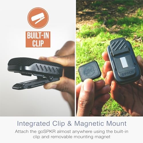 HANDS-FREE DESIGN w/CLIP + MAGNET: Use the goSPKR anywhere with the help of the built-in clip and removable magnet. Bring it with you while hiking, running or working out, wear it at work, or attach it to your golf cart, boat, or any other piece of magnetic metal!
