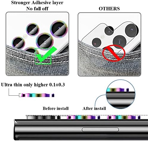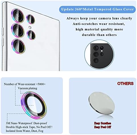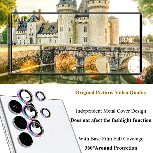 【Full Coverage Metal & Glass Camera Protector】—— The metal camera lens protector precision cutouts seamless fit with the Galaxy S22 ultra,edge to edge maximum protection your device from scratches,scrapes,and bumps; Anti-scatch/shock/bump and prevent shock or impact to your lens.With installation tray easy install no bubble,ultra clear lens glass take photo or picture the same as the smartphone original picture quality.